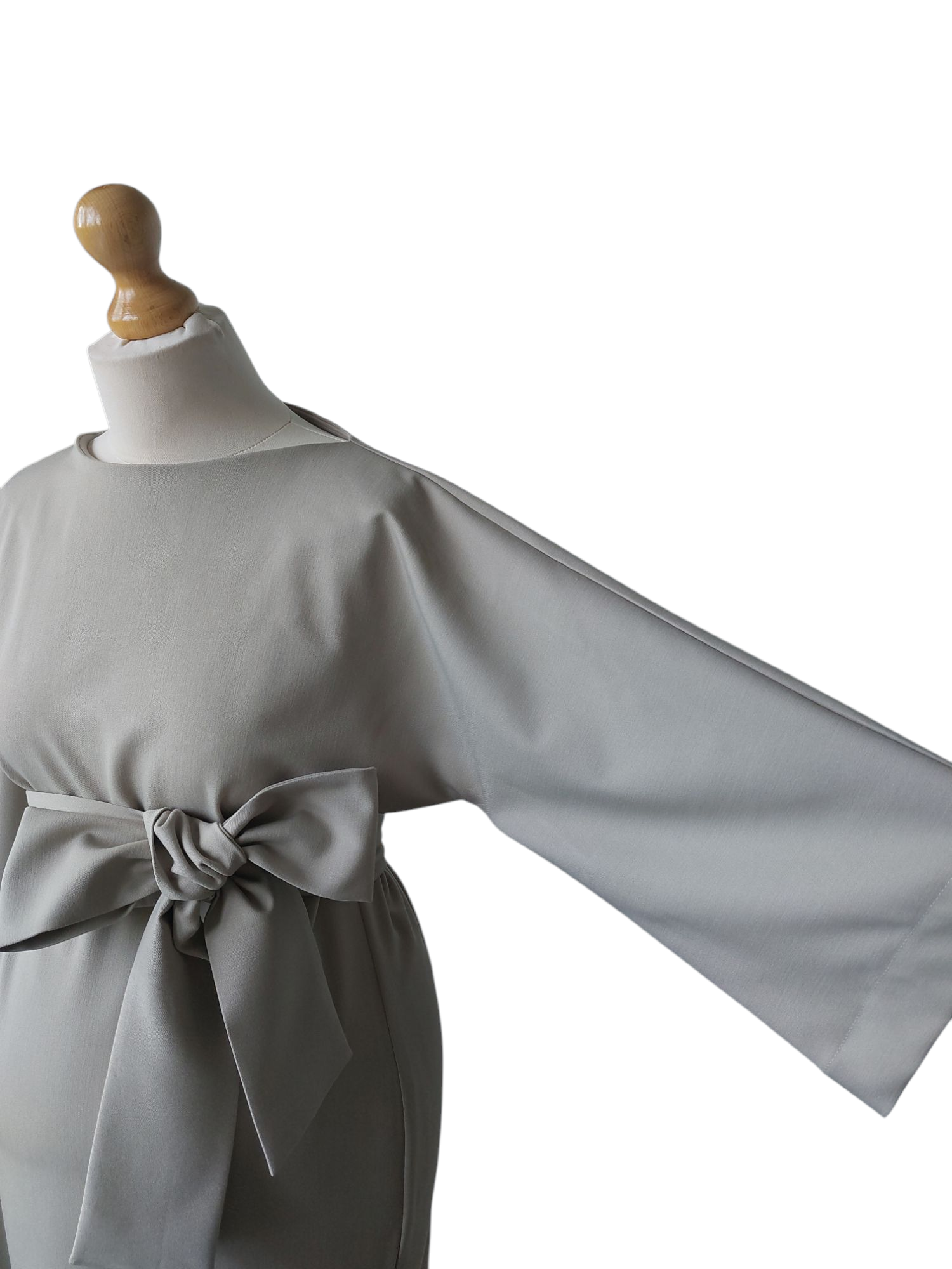 OverzichtJurk Gerrieke. Een prachtige stijlvolle jurk met aangeknipte rechtvallende wijde mouw en boothals. De jurk heeft een kuitlengte en heeft daarom een loopsplit in de zijnaad. En een extra lange ceintuur om een mooie strik te kunnen maken.