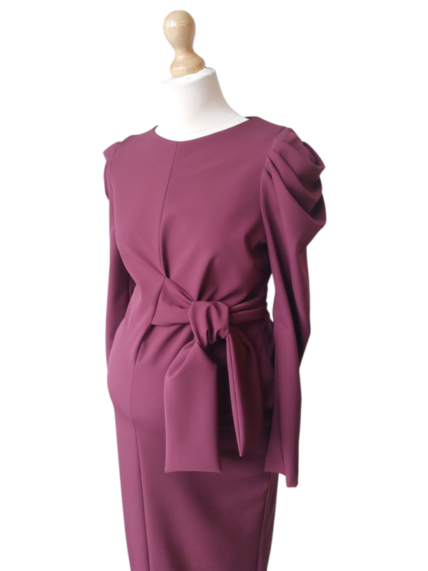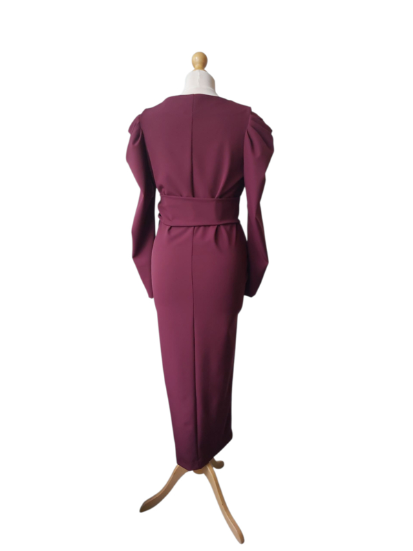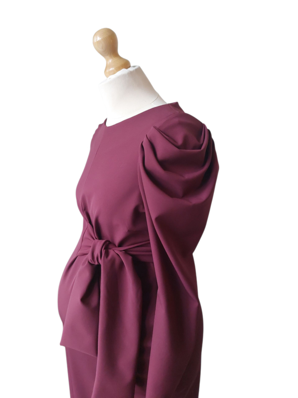 OverzichtJurk Willemien, deze prachtige jurk in de trendy kleur bordeaux is gemaakt van een stevige kwaliteit travel. Met een bijzondere plooimouw, maar een gewone gladde mouw is ook prachtig! Door de ceintuur creër je mooi je taille! De enkellange jurk met loopsplit middenvoor maken deze jurk echt prachtig voor elke gelegenheid