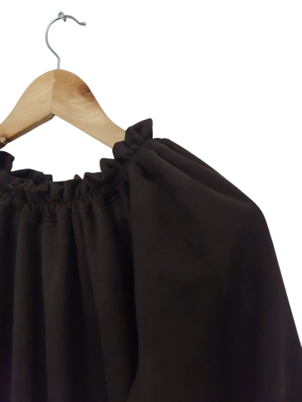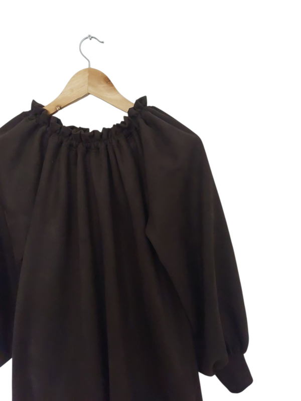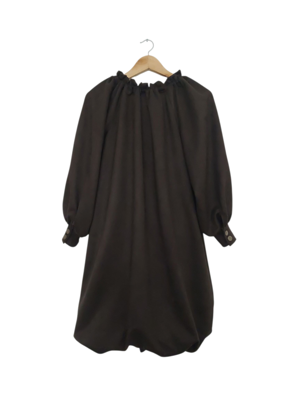 OverzichtJurk Dinthe 2 de wintervariant van de ballonjurk in een prachtige diep donkerbruine suede. De lange mouw met manchetten en knopen kan ook gemaakt in een lange ballonmouw zoals de zomervariant.